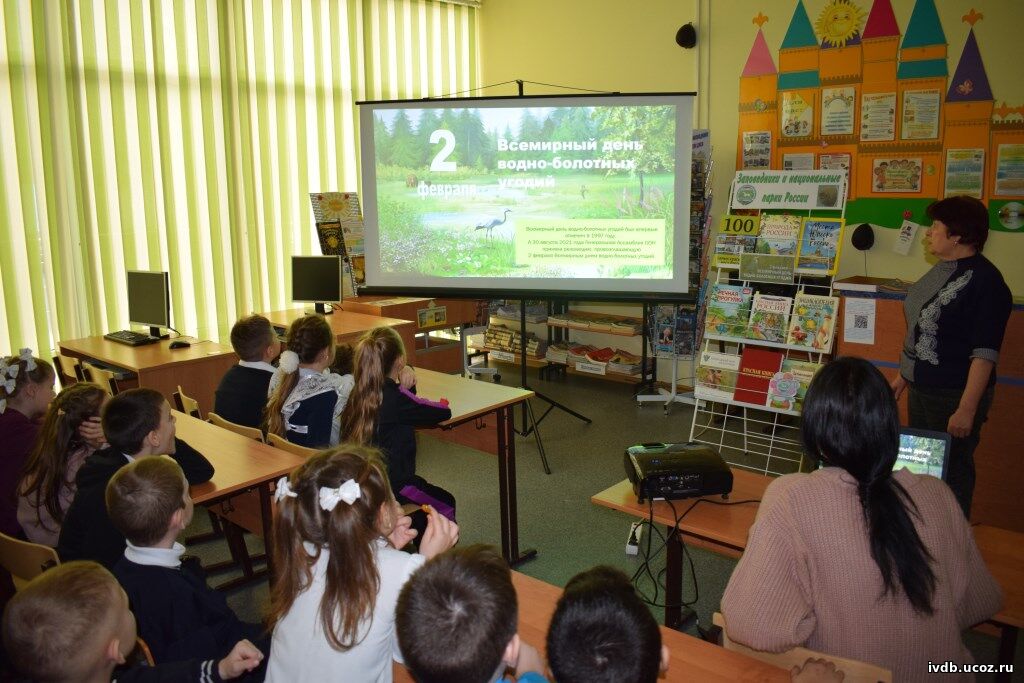 Здесь же в читальном зале дети совершили литературно-экологический круиз «По заповедникам и национальным паркам России», приуроченный к Всемирному дню водно-болотных угодий (2 февраля). С помощью презентации ребята познакомились с заповедником «Белогорье», узнали, как восстанавливалось поголовье зубров в Кавказском заповеднике, почему в озере «Байкал» обитают уникальные рыбы и животные, что собой представляет Васюганское болото протяженностью с запада на восток 573 км. и какие животные там обитают и т.д. Библиограф рассказала ребятам о книгах, представленных на выставке, ребята высказали своё мнение почему Красную книгу так называют.