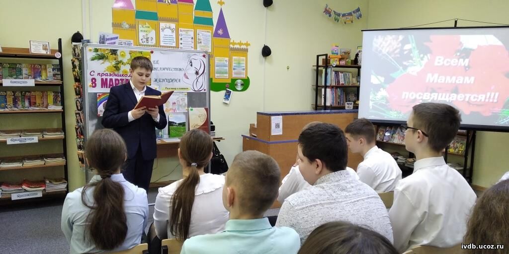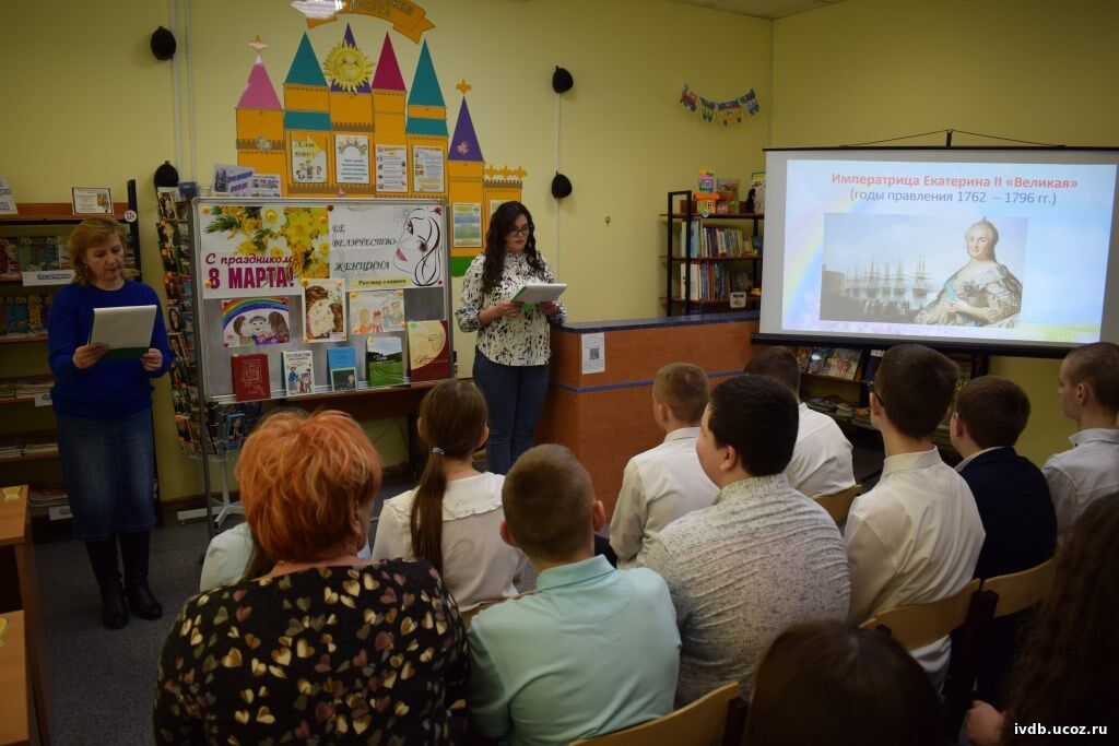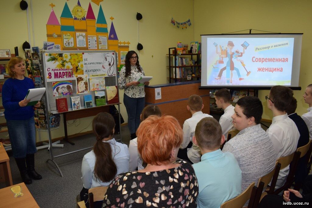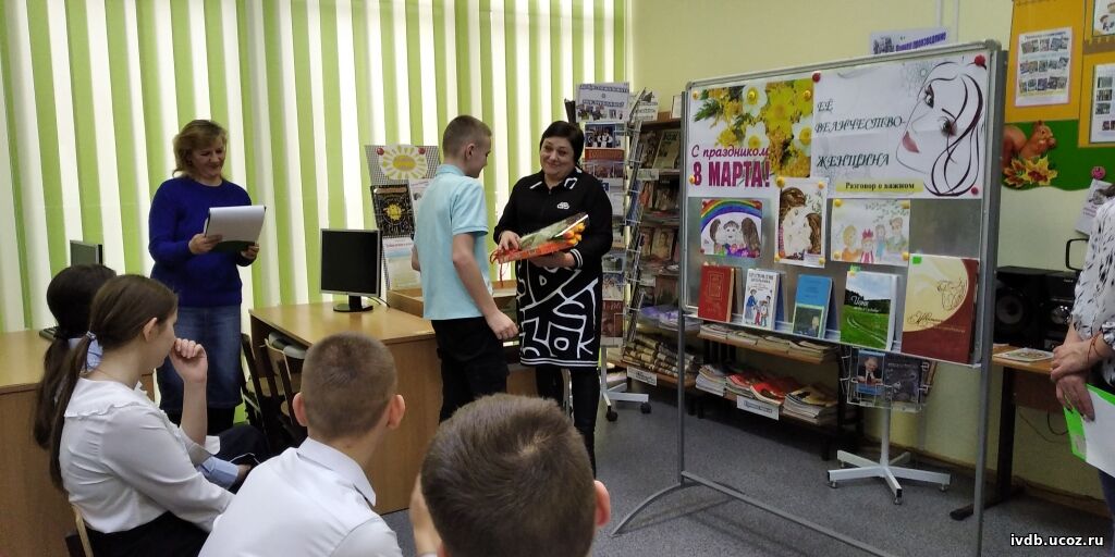 В преддверии Международного женского дня 8 марта в читальном зале Ивнянской детской библиотеки состоялся разговор о важном «Её величество – ЖЕНЩИНА!». В ходе, которого работники библиотеки рассказали подросткам о женщинах, оказавших существенное влияние на ход Российской истории, а также внесших весомый вклад в развитие науки, техники, культуры и литературы. Так же подростки узнали кто из женщин Ивнянского района и за какие заслуги удостоен почетного звания «Заслуженный учитель Российской Федерации», «Заслуженный врач и работник здравоохранения», «Заслуженный работник культуры», «Почетный гражданин Ивнянского района».